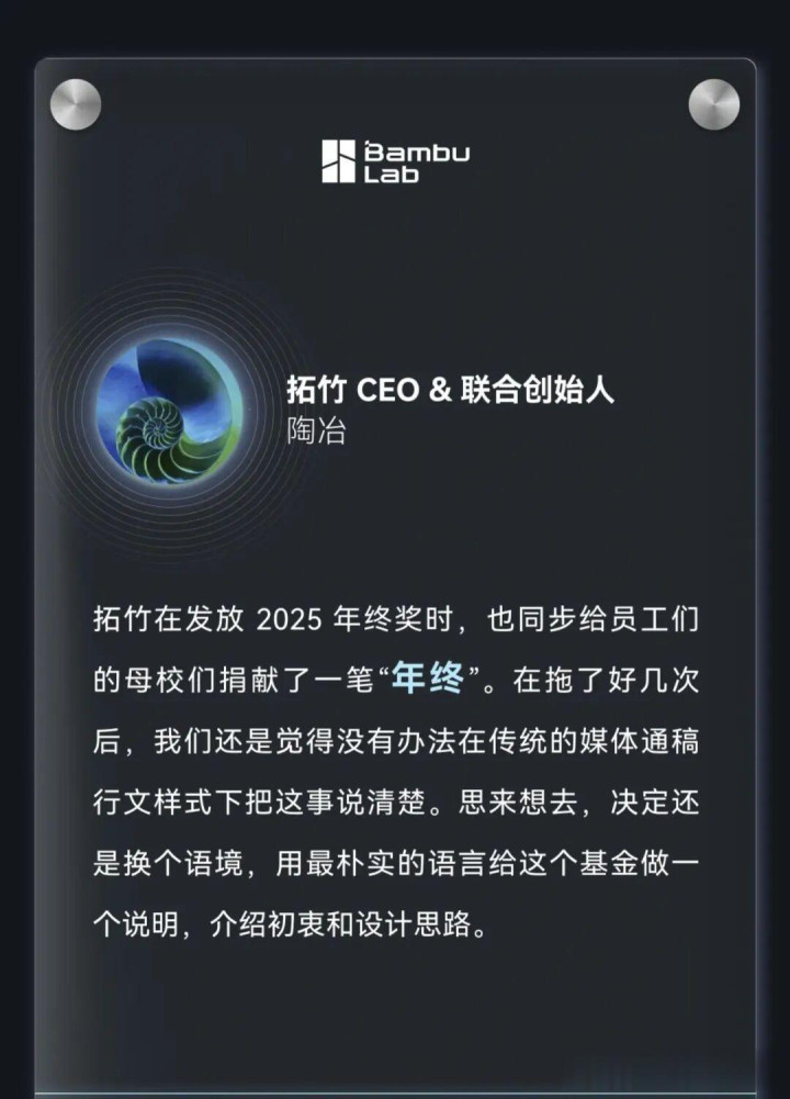 最近,拓竹向员工母校捐赠1亿元的消息刷爆全网。各大媒体争相报道,被不少人称为2026年最热闹的一次“年终奖”。